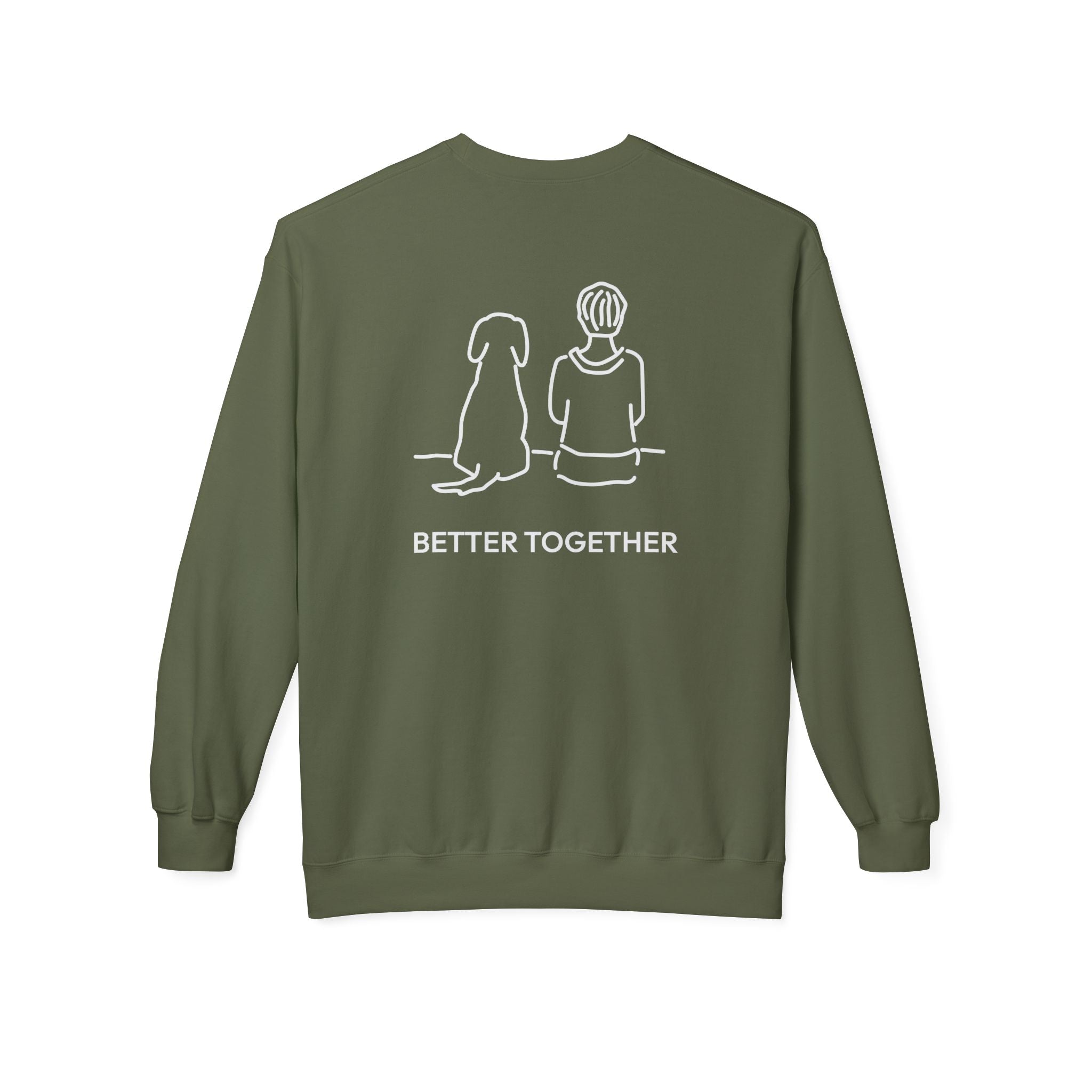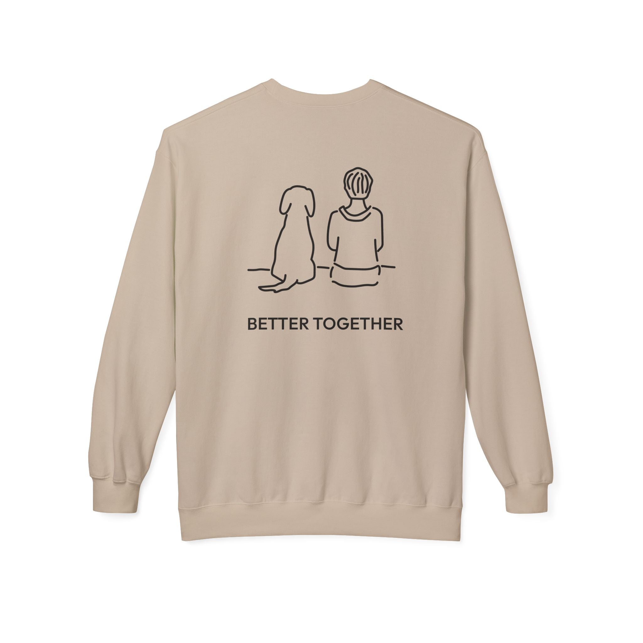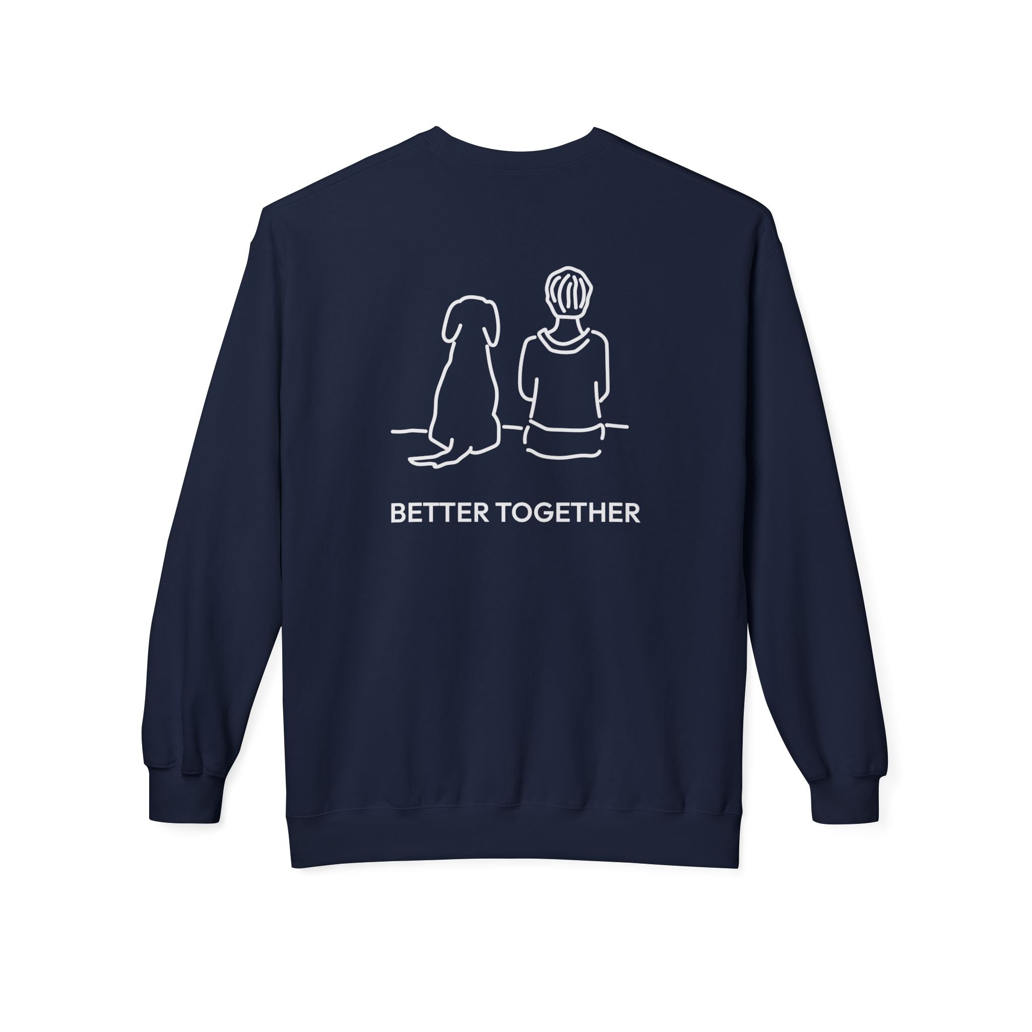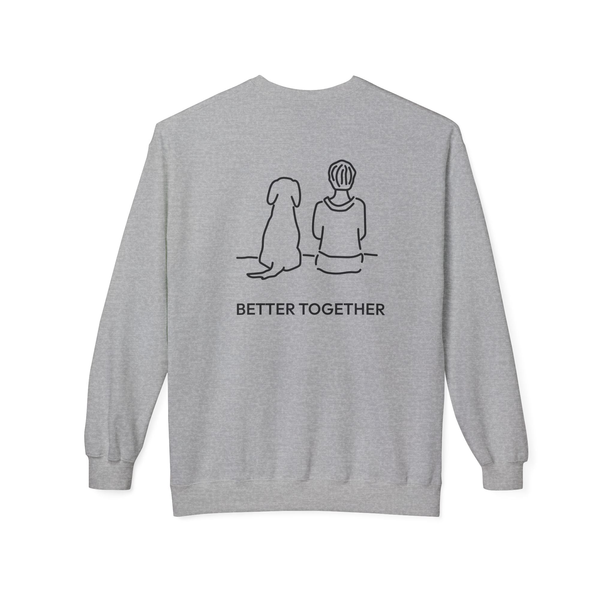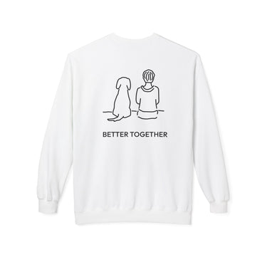 The Design Story: Make room for your new favorite sweatshirt with the MoreWoof “Better Together (Back Print)” Softstyle Fleece Sweatshirt. The minimalist sketch of a boy and his dog sitting side by side celebrates the amazing bond between us and our dogs, while the accompanying phrase “Better Together” reflects the love, loyalty, and partnership that enrich every moment.