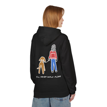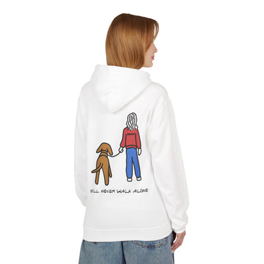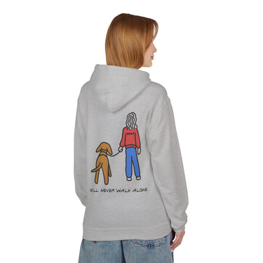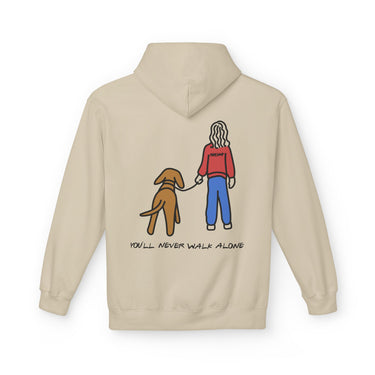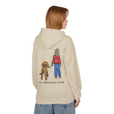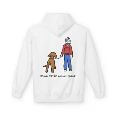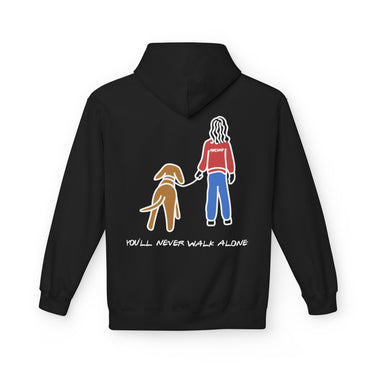 Transform your casual wardrobe with our stylish You’ll Never Walk Alone hoodie for serious dog lovers. The heartfelt design of the back view of a woman and her faithful dog walking together, step for step, makes this one of MoreWoof’s most popular hoodies. You’ll Never Walk Alone reflects the loyalty of dogs and the comfort they bring, especially when we need it most. Whether you’re walking your dog or just lounging at home, MoreWoof's softstyle hoodies give you the perfect combination of a great fit and unique hand-crafted design that will make you feel as good as you look. Expertly crafted from an 80/20 cotton/poly blend for ultimate comfort and a soft premium feel, the hoodie’s dropped shoulder design ensures a perfect shape and a classic style. And, of course, the large pouch pocket is a must for holding essential items like treats and a leash while you’re on the go. It's a thoughtful gift for casual wearers, pet lovers, and anyone who values both style and comfort. Celebrate special moments like friends’ gatherings, casual meetups, or cozy holidays, making it a go-to piece during sweater weather or family celebrations.
