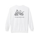 Transform Your Look: Transform your casual wardrobe with the MoreWoof "Life Is Better With a Dog" Softstyle Fleece Sweatshirt (Bicycle - back print design). With clean, hand-drawn lines, this sweatshirt features the delightful image of a person and dog enjoying a tandem ride, highlighted by the phrase “Life Is Better With A Dog.” Both sweet and humorous, it’s a wearable tribute to companionship, outdoor fun, and the joy of going through life side by side with your dog.