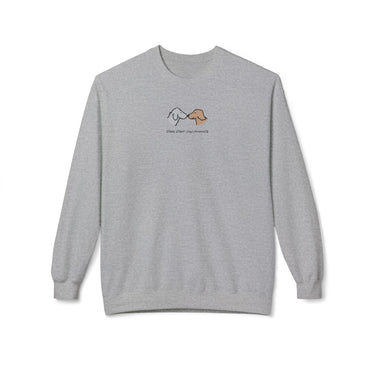 Spread the message of love and compassion with the Morewoof Dogs Don't Discriminate softstyle fleece sweatshirt. Made with an 80-20 cotton-poly blend, it offers unbeatable coziness and durability, making it perfect for any weather or just snuggling with your dog on the couch! The heartfelt "Dogs Don't Discriminate" design by artist Mimi Bergson celebrates the extraordinary unconditional love of dogs -- reminding us humans to treat everyone fairly and with kindness, no matter their background. This sweatshirt provides a cozy wearing experience packed with style that you'll love wearing again and again.