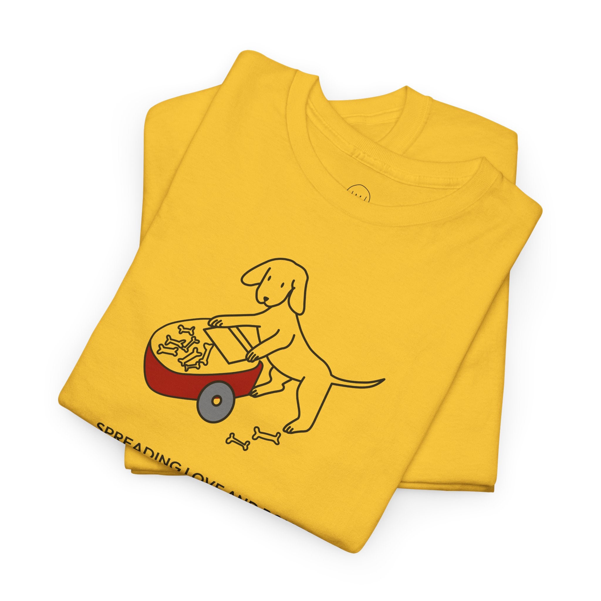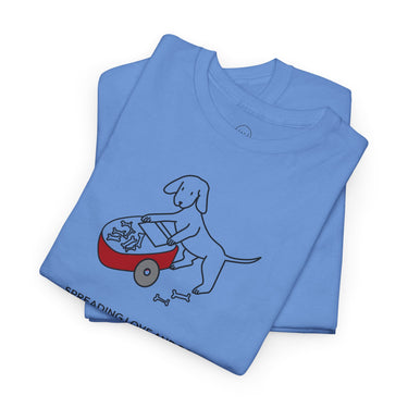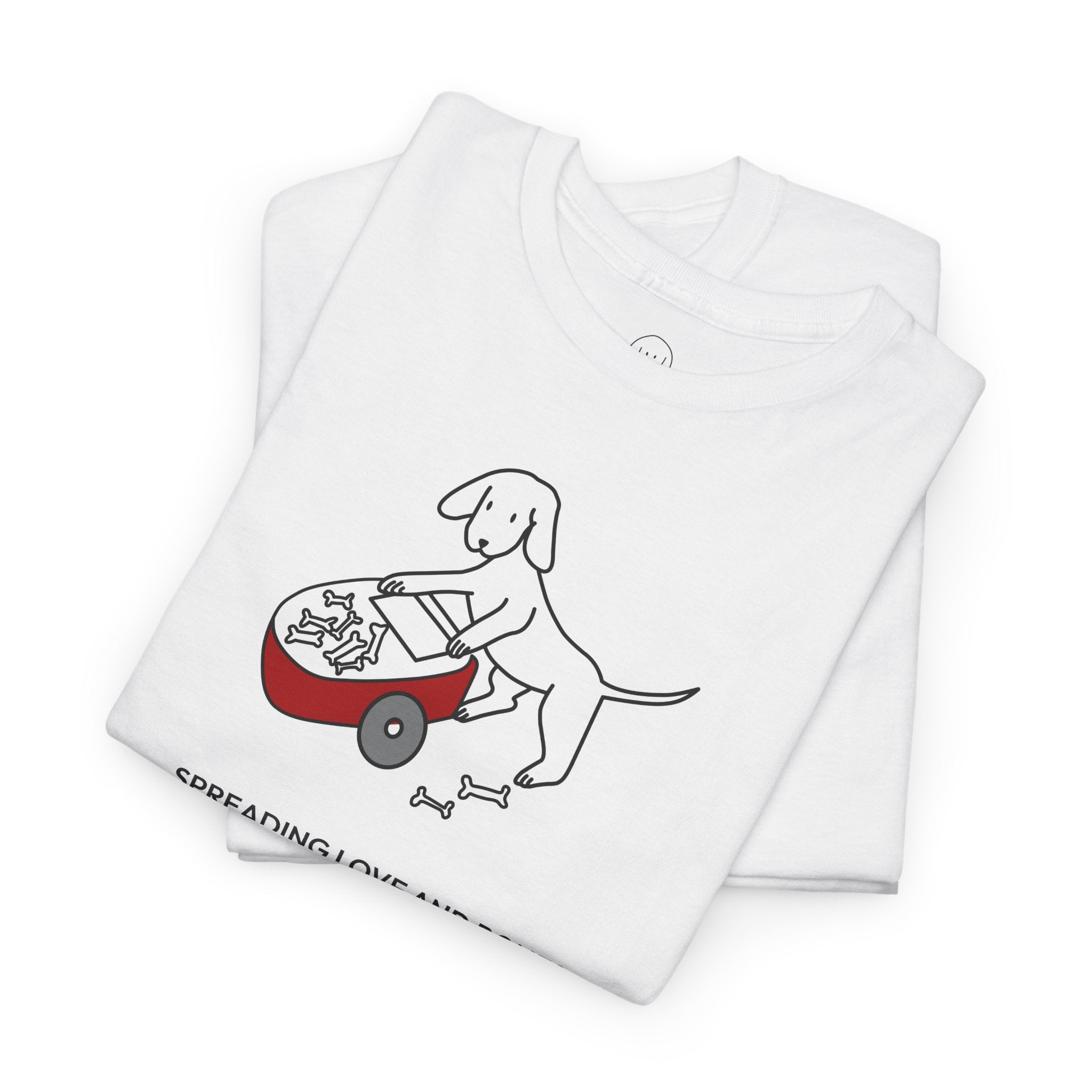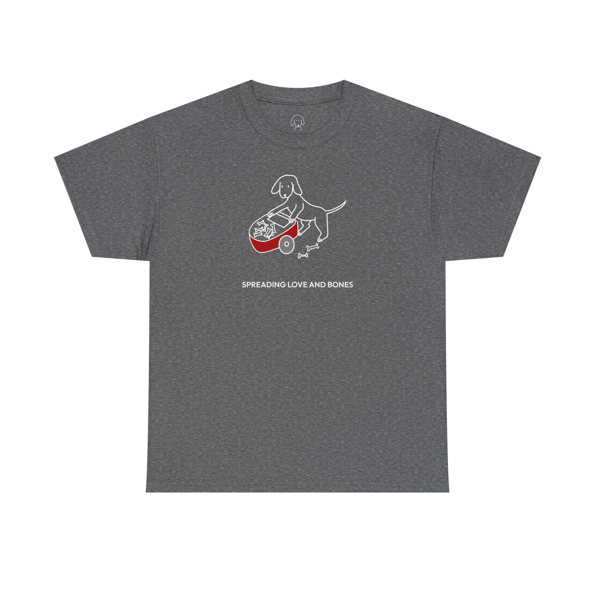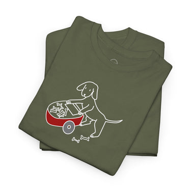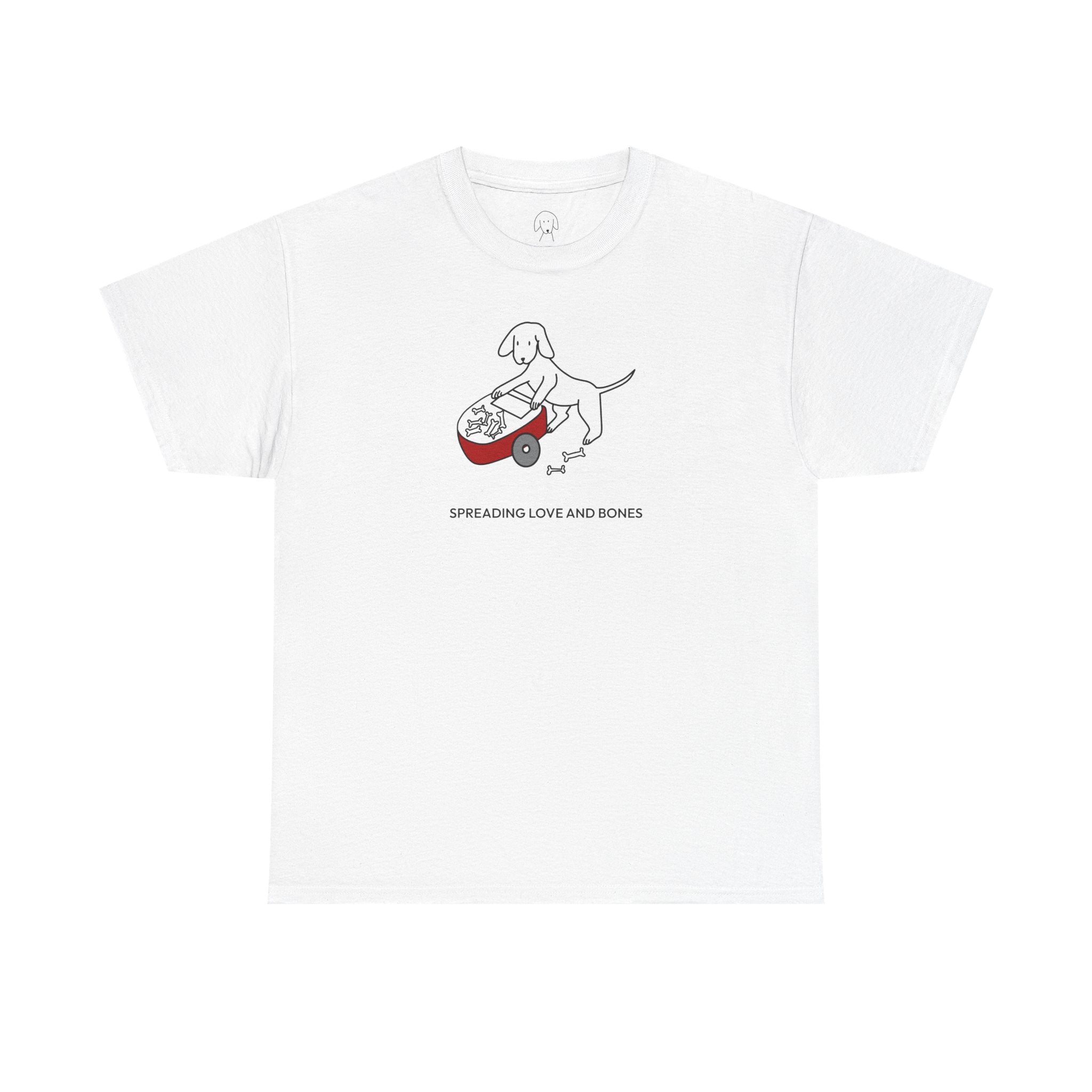 The Design Story: Upgrade your casual wardrobe with this MoreWoof soft cotton tee. A heartfelt design of a dog pushing a wheelbarrow of bones and sharing them with others depicts the generous spirit and unconditional love shown by dogs, captured by the saying, "Spreading Love And Bones." Of course, some dogs aren't always great at sharing this particular treat – but we like to think it's the thought that counts.