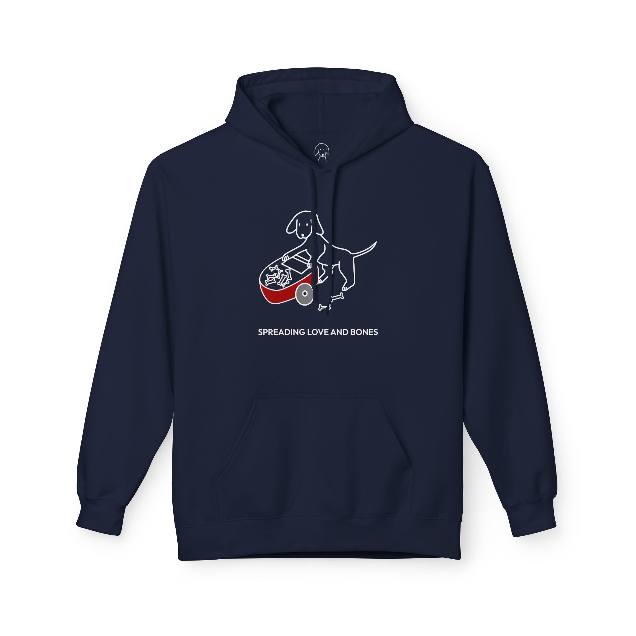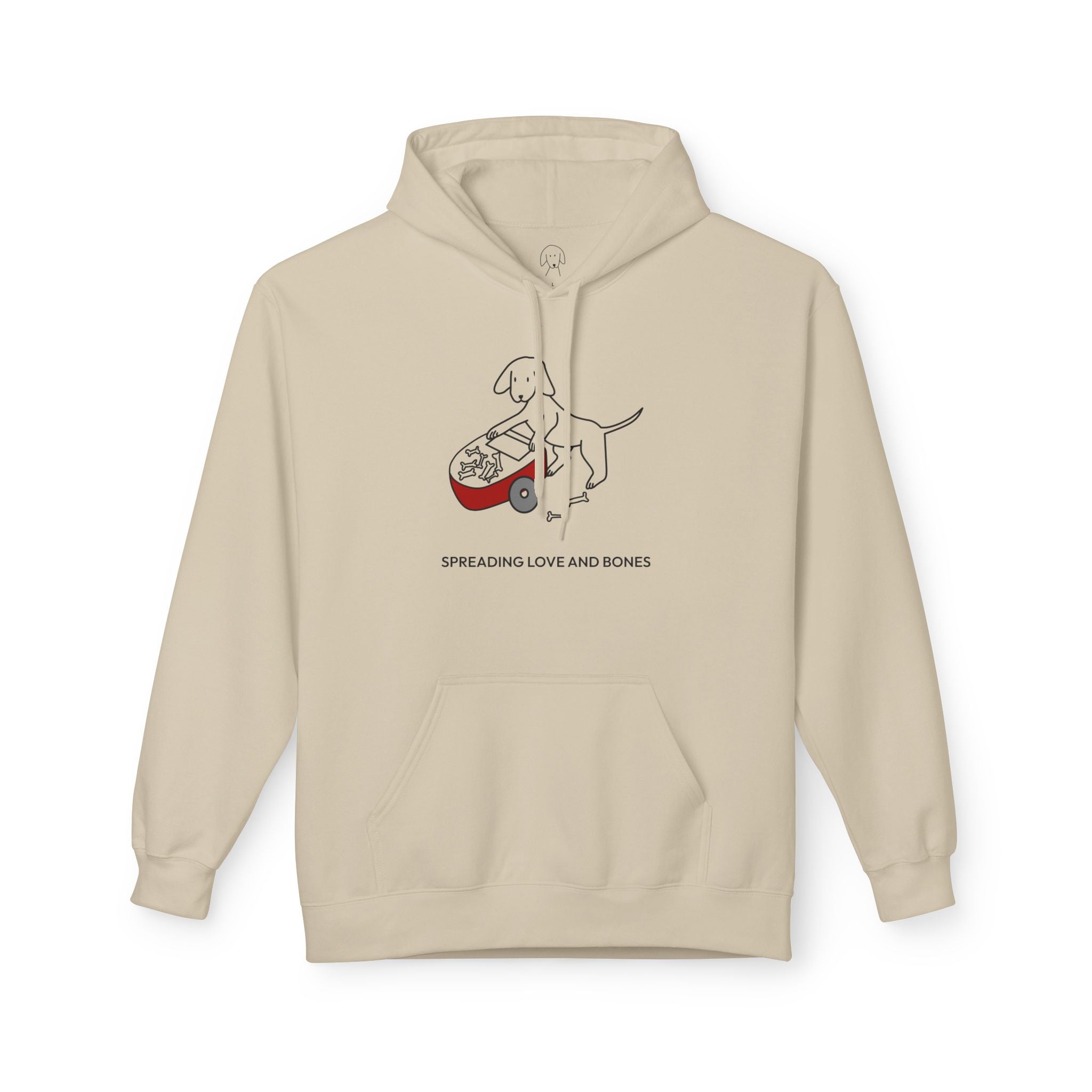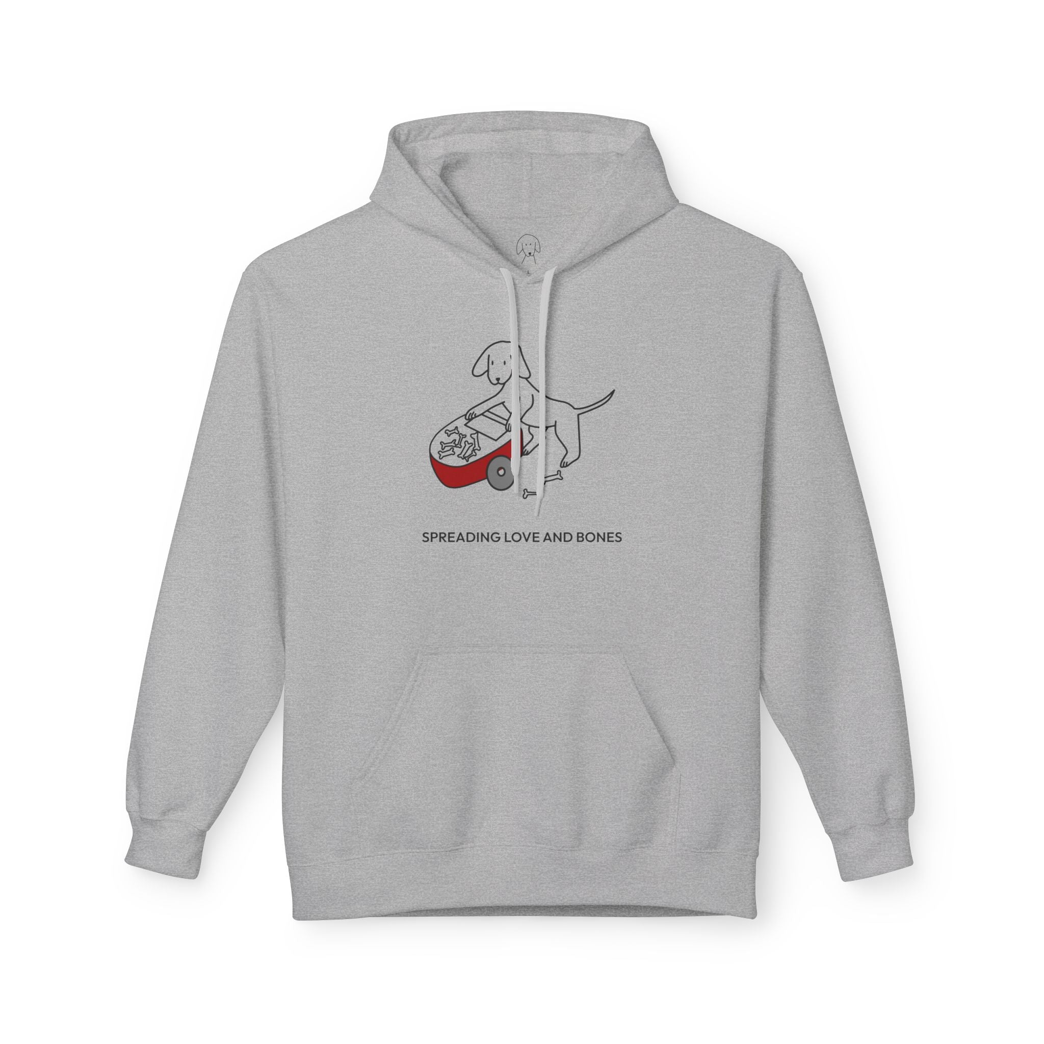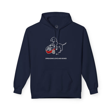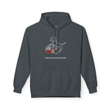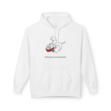 The Design Story: Transform your casual wardrobe with the "Spreading Love and Bones" Softstyle Fleece Hoodie. This heartfelt design of a dog pushing a wheelbarrow of bones and sharing them with others depicts the generous spirit and unconditional love shown by dogs, captured by the saying, "Spreading Love And Bones." We recognize that some dogs aren't always great at sharing this particular treat but we like to think it's the thought that counts.